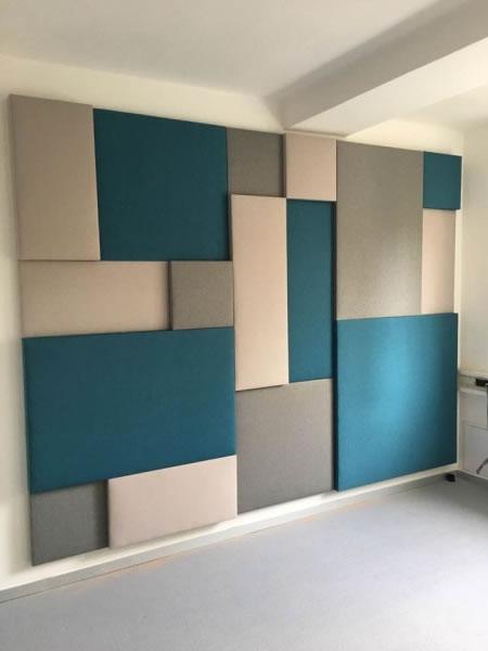 Další z možných variant jsou čalouněné desky z překližky silné 9 mm, vhodné do menších místností – kanceláře, pracovny, obývací pokoje. Destičky mohou být změkčeny 2 cm PUR pěny, pak jsou vyšší a zaoblené, či pouze PES rounem a pak mají rovné hrany.