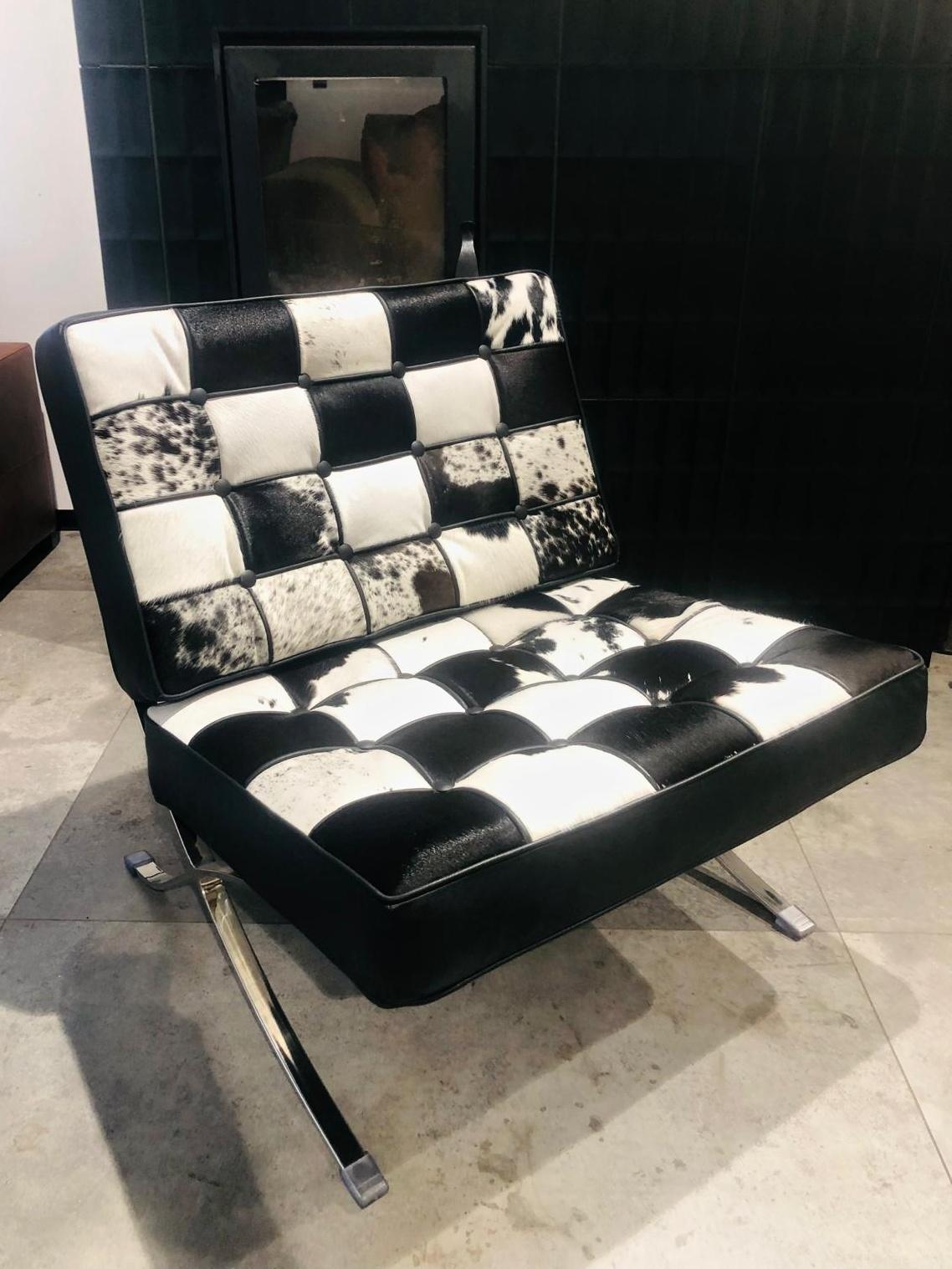 Originální designové křeslo Barcelona jsme očalounili pravou kravskou kůží se srstí v kombinaci s klasickou hladkou kůží.