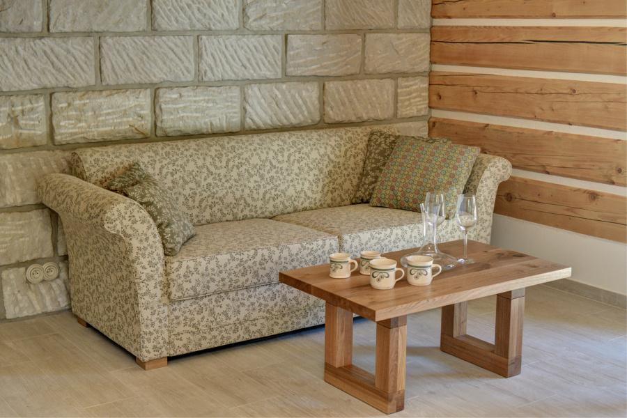 Rozkládací pohovka je zespodu opatřena nízkými dřevěnými nožkami, které ji izolují od podlahy. Moření nožek si můžete vybrat z našeho vzorníku.