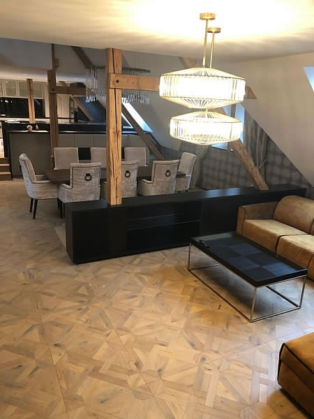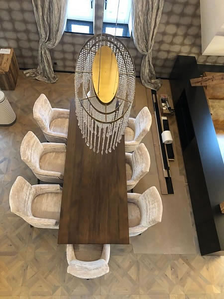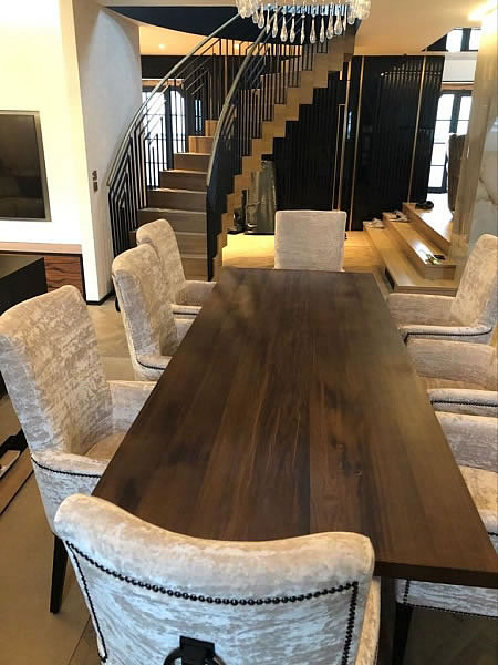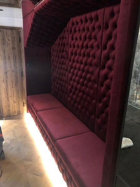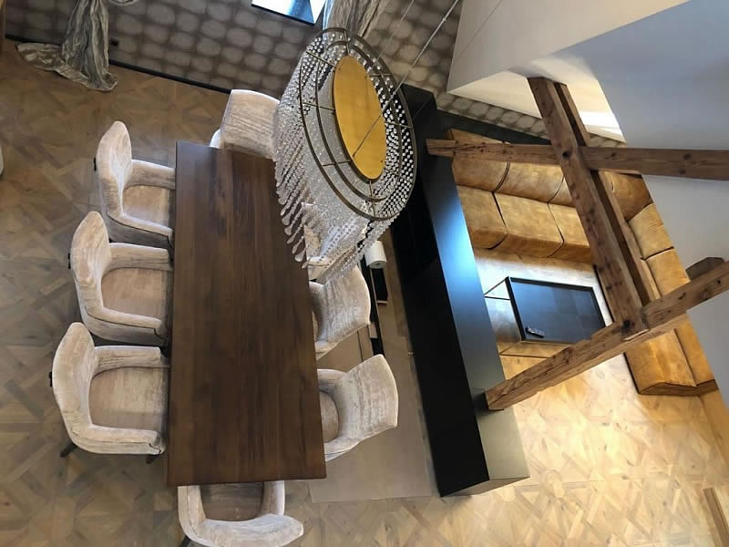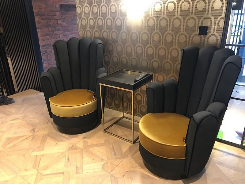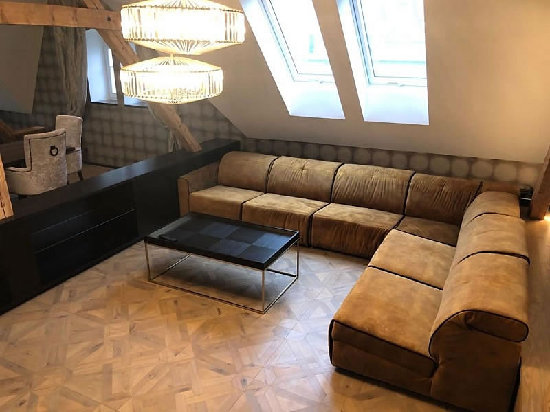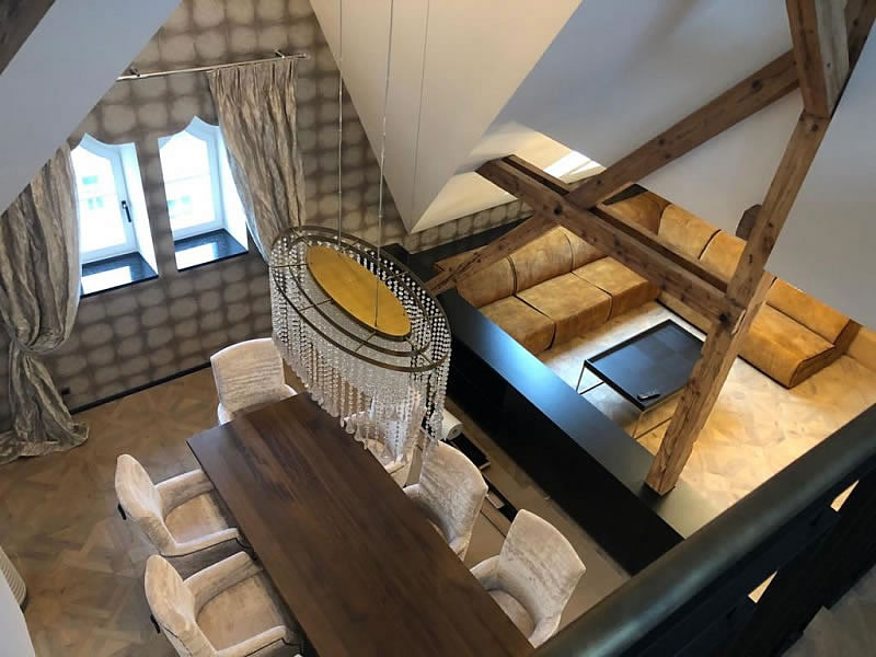 Do interiéru mezonetového bytu v Praze jsme vyráběli na míru čalouněný nábytek. V předsíni jsme čalounili atpickou lavici do výklenku v sametové látce se sklady. Atypická křesla se zajímavým opěrákem mají sedáky ve žluté sametové látce, opěráky křesel a záda jsou z matně černé broušené koženky. Křesla stojí na černě mořených lakovaných dřevěných soklech. V jídelně poskytují pohodlí u stolu atypická křesílka Kolombo s prodlouženým opěrákem, čalouněná sametovou látkou s kontrastními hřebíky v odstínu staromosaz. Křesla jsou pro lepší manipulaci opatřena klepadly v matné černi, nohy jsou lakované, mořené načerno. Sedací souprava v obývacím pokoji je atypickým provedením modelu Lambda s relaxačními elementy. Souprava je potažena hnědou látkou se vzhledem broušené kůže a ozdobena paspulemi v kontrastní černé barvě. Nohy jsou dřevěné, černě mořené. Autorem návrhu je designové studio Simplin.