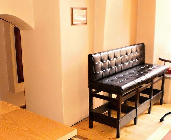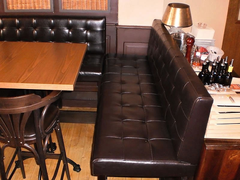 Lavice mají masivní podnože, které jsou namořeny v odstínu wenge, díky čemuž ladí se židlemi a ostatními dřevěnými prvky v interiéru. Čalounění je z tužších pěn vhodných pro použití ve veřejných prostorách. Potah lavic je prošívaný do čtverečků se vtahy, což dodá interiéru rustikální styl. K očalounění byla použita foliovaná kůže Bycast. Tato kůže má velmi lesklý povrch a díky vrstvě nalisovaného polyuretanu je extrémně odolná a snadno udržovatelná, a tudíž je vhodná pro použití ve veřejných interiérech.