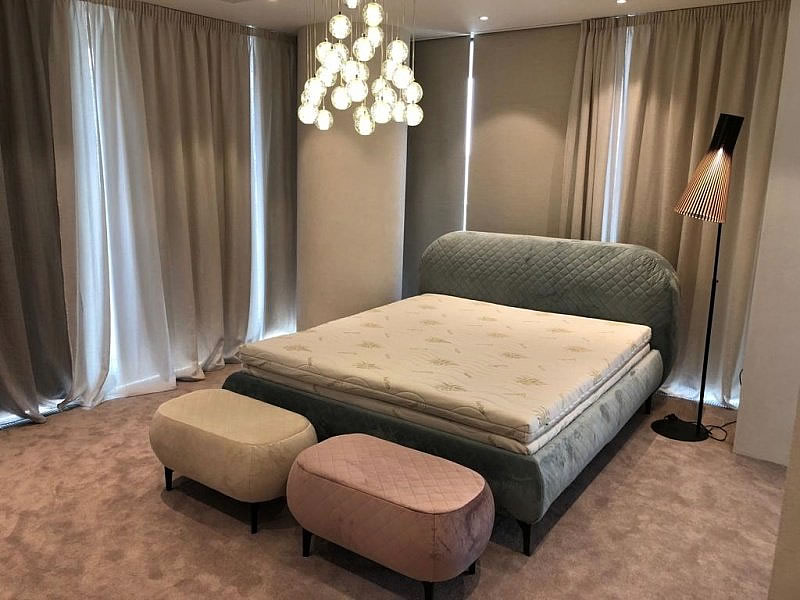 Do ložnice bytu jsme vyráběli čalouněnou postel s čelem s výškou lehací plochy 66 cm. Postel je doplněna taburetkami ve stejném stylu s výškou sedu 45 cm. Postel i taburetky jsou potaženy luxusní prošívanou textilií Odyssey v různých odstínech a stojí na černých kovových nožkách.