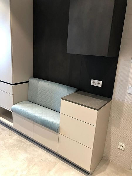 Do ložnice a do předsíně jsme dále vyráběli čalouněné rámy zrcadel, potažené textilií Odyssey. V předsíni je též na botníkem čalouněná lavička pro usednutí při přezouvání.