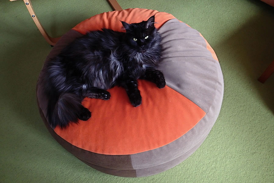 Podle přání zákazníka jsme vyrobili měkký taburet vyplněný čechraným polyesterem. Ten si oblíbily hlavně děti a kocourek rodiny. Taburet je oboustranný a je potažen textilií Carabu v oranžovém a světle hnědém odstínu. Textilie Carabu je dobře omyvatelná, což bylo hlavní prioritou zákazníka.