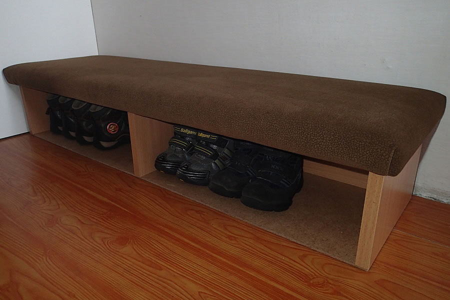 Praktickým doplňkem v interiéru je dětský botník se sedátkem. Tento botník jsme vyrobili na míru dle přání našeho zákazníka. K výrobě bylo použito lamino s bukovým dezénem. Sedací plochu jsme změkčili 2 cm PUR pěny a očalounili omyvatelnou potahovou textilií Carabu v hnědém odstínu.