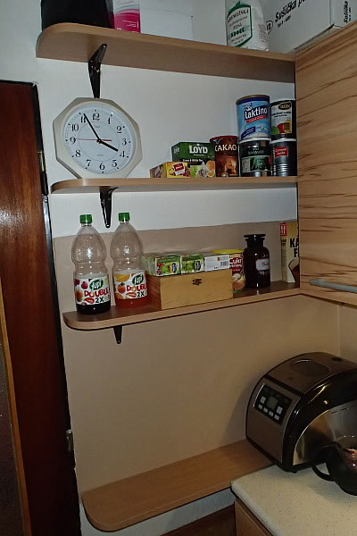 Poličky na míru na další fotografii byly vyrobeny z lamina s bukovým dezénem. Tvar polic si navrhl zákazník a vyráběli jsme je dle dodané šablony. Police díky tomu dokonale pasují, přestože je zeď trochu křivá. Montáž si provedl sám zákazník pomocí kovových úhelníků.