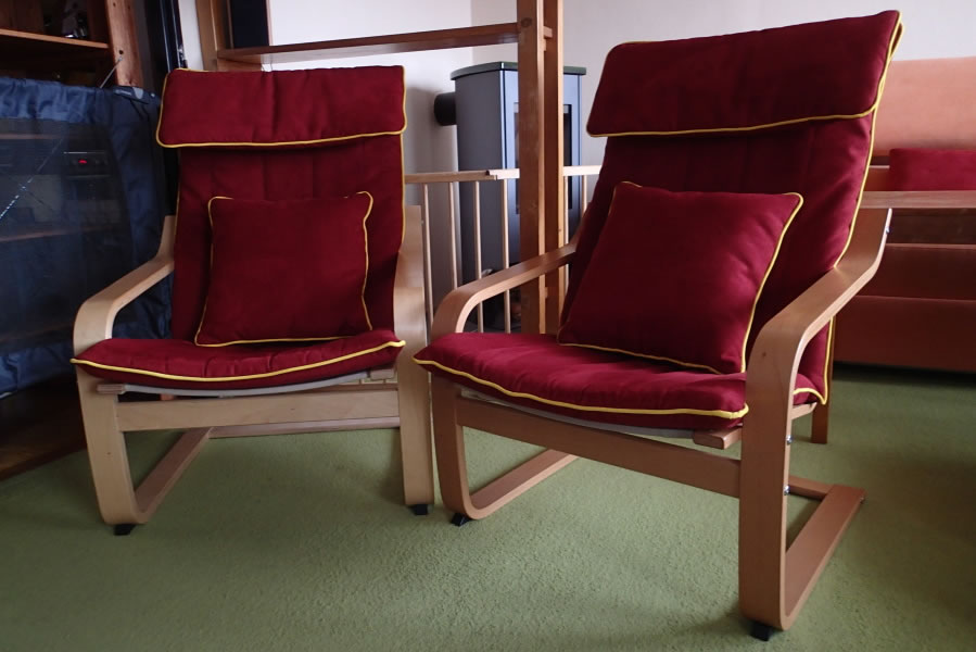 Při renovaci křesel z obchodního domu IKEA jsme nové potahy ušili podle těch starých, které již dosloužily. Na potahy si zákazník vybral velice odolnou textilii Sabbi, která je pratelná a uchová si svůj vzhled i při používání křesla zvířecím mazlíčkem. Zákazník zvolil tmavě červený odstín textilie a zdobení paspulemi v kontrastním žlutém odstínu. Ke křeslům jsme ušili dva polštáře na míru ve stejném designu.
