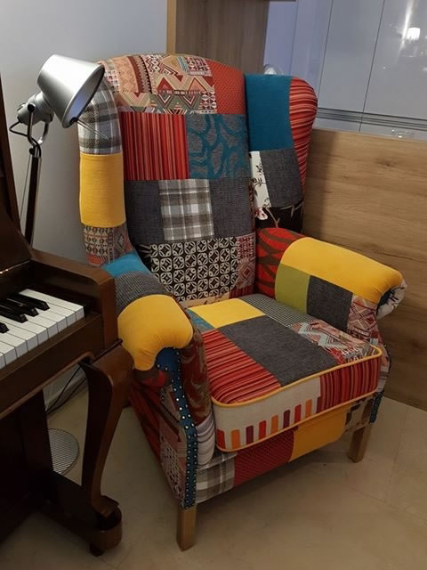 Dalším zajímavým kouskem v obývacím pokoji je ušák Lyon. Jelikož je náš zákazník vyšší postavy, zvýšili jsme opěrák ušáku o 10 cm. Úprava rozměrů pro nás není překážkou, jelikož konstrukci ušáků vyrábíme z masivního dřeva. Ušák jsme potáhli různými látkami sešitými metodou patchwork.