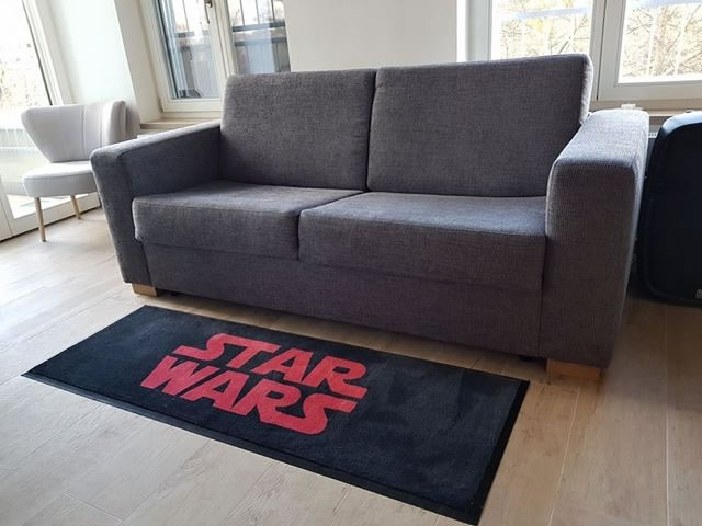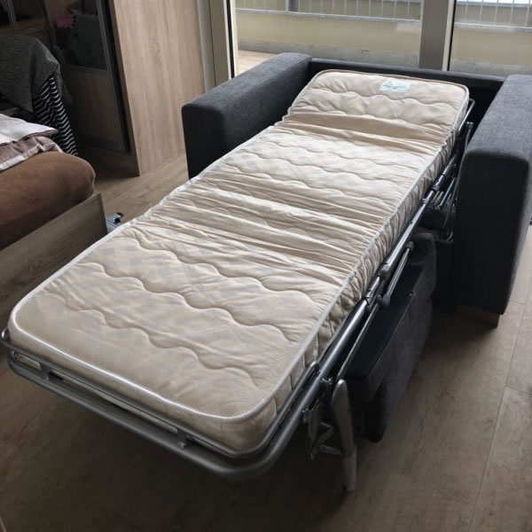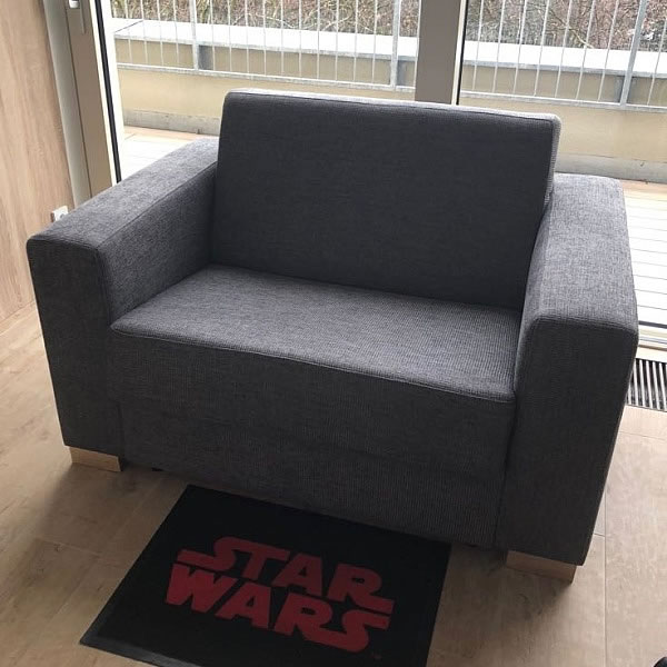 Do studentského pokoje jsme vyrobili rozkládací pohovku Betta s vysoce kvalitním celokovovým rozkládacím mechanismem. Výhodou tohoto systému rozkládání je matrace vcelku o rozměrech 140×200 cm, která je poskládána v konstrukci. Pohovku jsme očalounili stejnou látkou jako sedačku v obýváku a doplnili jsme ji dubovými nožkami.