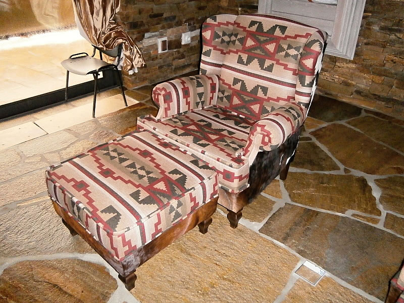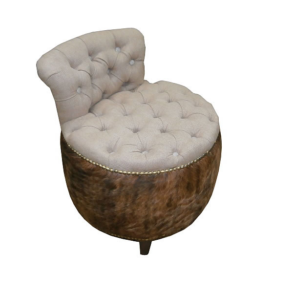Na čalouněná křesla jsme použili látku v kombinaci s kůží se srstí. Chlupatou kůží jsme potáhli spodek, boky a záda křesel, a stejně tak i spodní části taburetů. Sedáky ušáků i taburetů jsme ozdobili silnou paspulí (zvýrazněný okraj). Dřevěné nožky jsme namořili v odstínu ořech.