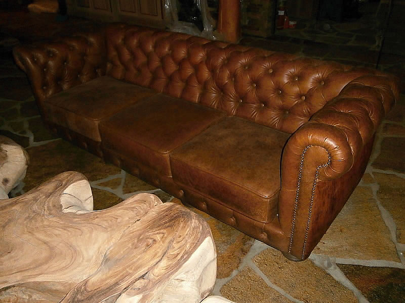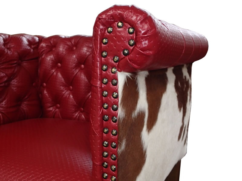 Kožené pohovky ve stylu Chesterfield jsme vyrobili na základě rozměrů dodaných zákazníkem. Potahy jsme ušili z luxusní hnědé kůže a boky a záda pohovek jsme očalounili kravskou kůží se srstí v hnědém odstínu. Područky a opěrák ozdobily čalouněné koflíky a vtahy, což je pro chesterfieldský styl typické. Na přední části područek jsme přibili ozdobné nýty. Nohy pohovek jsme vyfrézovali do požadovaného tvaru a namořili v hnědém odstínu.