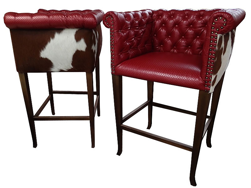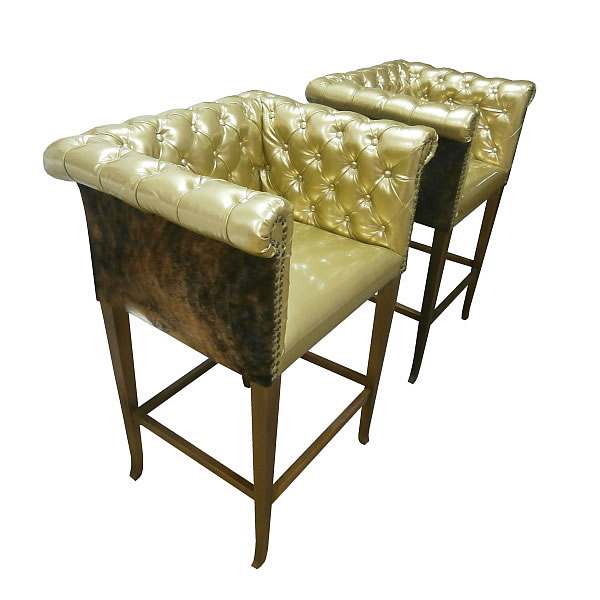 Netradiční barové židle ve stylu chesterfield jsou vyrobeny z masivního bukového dřeva. Na základě vizualizace s rozměry jsme vyrobili vzorek židle, který jsme olepili PUR pěnami, a zákazník si židli mohl vyzkoušet a navrhnout změny některých rozměrů. Barové židle jsme čalounili luxusními koženkami v kombinaci s chlupatou kožešinou v hnědobílém a hnědém odstínu. Červená koženka je z kolekce Divino a zlatá koženka je z kolekce Dekoma.
