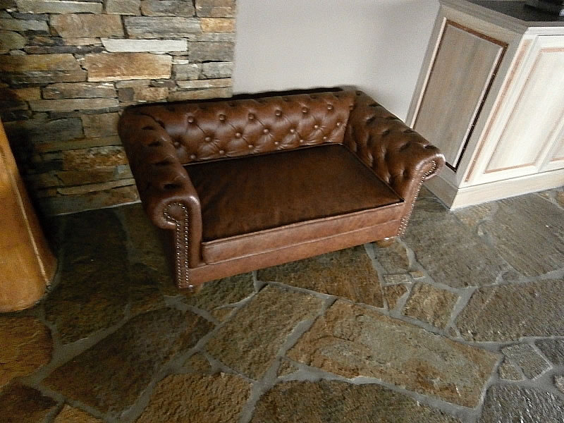 Do tohoto srubu jsme také vyrobili na zakázku luxusní pohovku pro psa. Tento zvířecí pelíšek jsme na přání zákazníka navrhli ve stejném stylu jako pohovky v obývacím pokoji. Pohovka chesterfield pro pejska je potažena hnědou kůží.