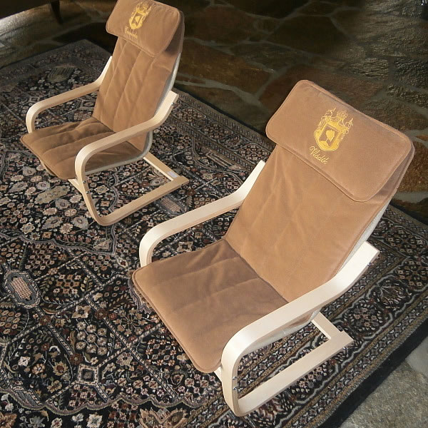 Kromě výroby čalouněného nábytku do srubu se zabýváme i jeho renovacemi. Dětská křesla dostala nové potahy z textilie Carabu a na záhlavníky jsme nechali vyšít erby se jmény dětí – obrázky s erby ve formátu .jpg nám dodal zákazník. Renovovaný taburet jsme potáhli novou textilií, spodní část taburetu jsme očalounili hnědou kůží se srstí.